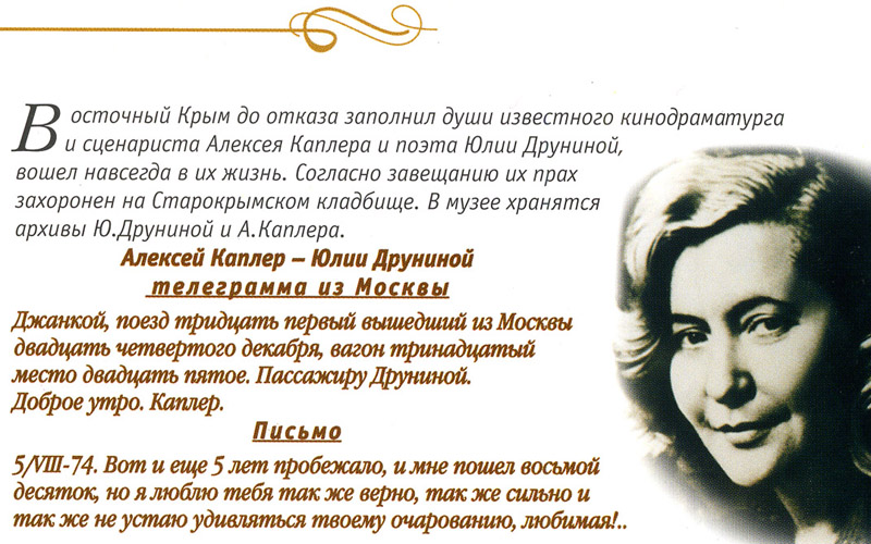 Портрет узятий із книги К. Паустовського «Обране», інші знімки— з реклам музеїв Старого Криму. Силует М. Волошина — робота фотографа-аматора.