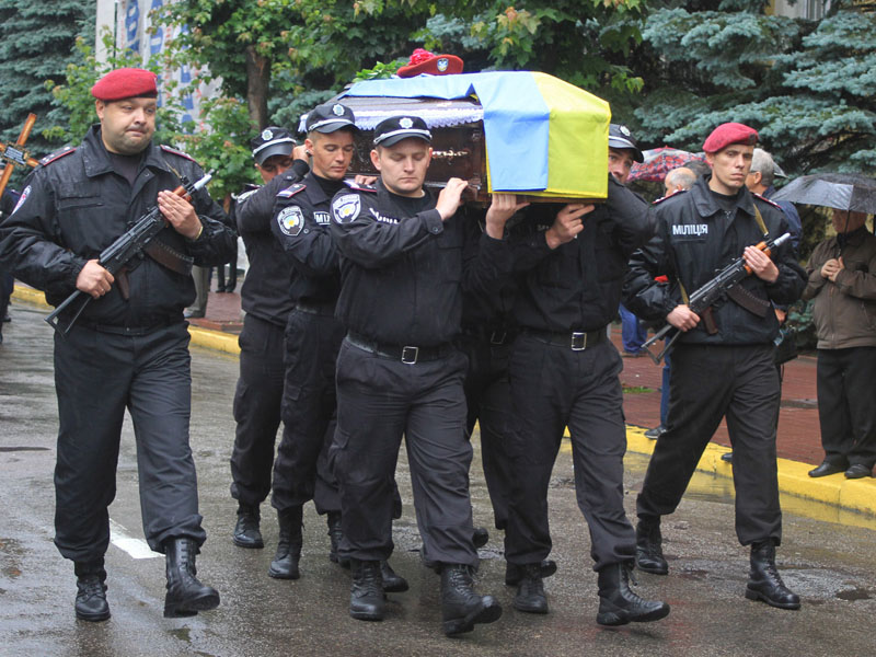 Тисячі прикарпатців попрощались із загиблими земляками, які перебували на борту збитого під Слов’янськом гелікоптера. Володимир Шарабуряк, Петро Остап’юк, Василь Семанюк, Володимир Лисенчук, Петро Безпалько та Віктор Яков’як служили у спеціальній роті міліції УМВС України в Івано-Франківській області. Трьох бійців поховали у Меморіальному сквері міста. Інших двох загиблих за бажанням рідних поховали в Коломийському районі. Тіло шостого силовика досі не можуть вивезти з Донецької області.