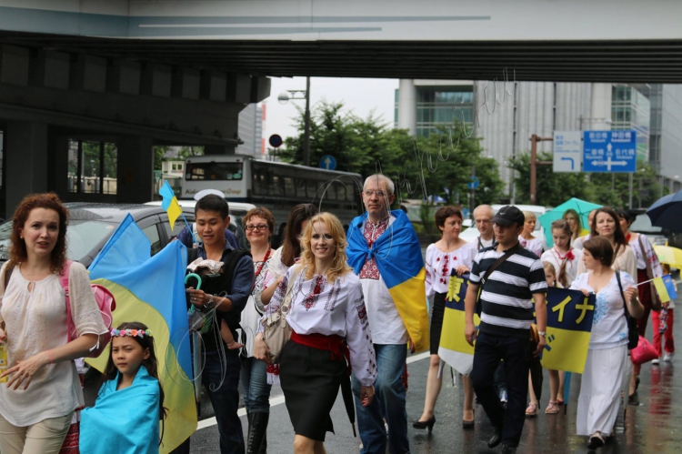 Токіо. 28 червня 2014 р. Під час мегамаршу у вишиванках з нагоди Дня Конституції України. Посол — у центрі з прапором.