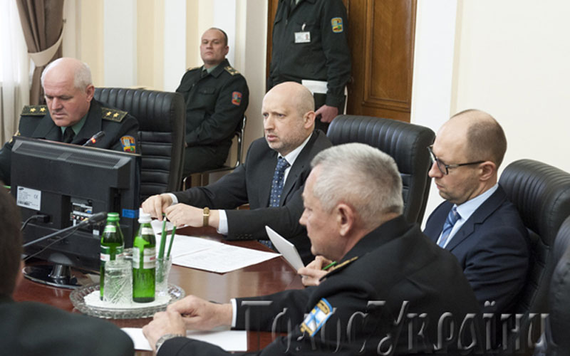 На знімку (зліва направо): начальник Генерального штабу генерал-лейтенант Михайло Куцин, в. о. Президента України, Голова Верховної Ради України Олександр Турчинов, Прем’єр-міністр України Арсеній Яценюк, в. о. міністра оборони України Ігор Тенюх.