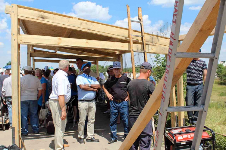 На пункті пропуску в Станиці Луганській рятувальники будують захисні накриття для громадян, які перетинають лінію розмежування (на знімку), щоб вони могли сховатися від сонця й дощу. Враховуючи погодні умови, начальник ГУ ДСНС України в Луганській області Ігор Савельєв звернувся до міжнародних благодійних організацій з проханням посприяти в будівництві таких укриттів на території транзитного пункту. Першими відгукнулися представники ООН, виділивши необхідні будівельні матеріали. Роботи зі встановлення опор і даху взяли на себе фахівці аварійно-рятувального загону, а допомагають їм рятувальники Станично-Луганського і сусідніх районів. Захисними накриттями може користуватися тисяча громадян.