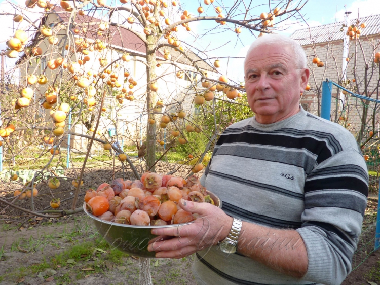 — У мене дача вже років із дев’ять. Шість років тому дізнався, що розплідник під Новою Каховкою, який тоді співробітничав із Нікітським ботанічним садом у Криму, пропонує нові сорти хурми, що можуть витримувати до двадцяти восьми градусів морозу. Загорівся ідеєю і собі спробувати її виростити. Адже я хурму люблю, але на ринку вона «кусається». Тому поїхав до розплідника й купив дворічні саджанці трьох різних сортів. Посадив, і з подивом переконався, що з хурмою значно менше клопотів, ніж із звичайними абрикосами, персиками та вишнями. Шкідники екзотичне дерево не чіпають, незвичайні плоди птахи й звірі на смак пробувати не ризикують.