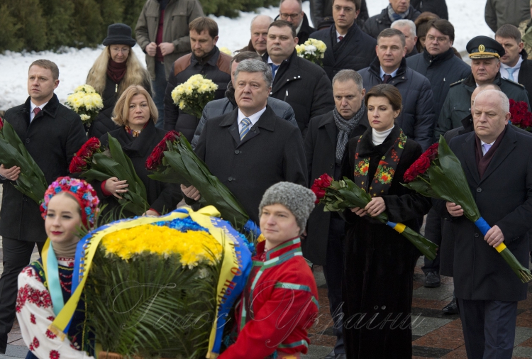 На знімку: Президент України Петро Порошенко з дружиною Мариною, Перший заступник Голови Верховної Ради України Ірина Геращенко (друга ліворуч), Перший віце-прем’єр-міністр — міністр економічного розвитку і торгівлі України Степан Кубів (крайній праворуч) під час церемонії покладання квітів до пам’ятників Тарасу Шевченку і Михайлу Грушевському з нагоди Дня Соборності України.
