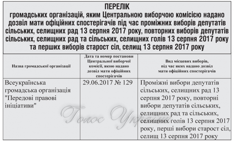 громадських організацій, яким Центральною виборчою комісією надано дозвіл мати офіційних спостерігачів під час проміжних виборів депутатів сільських, селищних рад 13 серпня 2017 року, повторних виборів депутатів сільських, селищних рад та сільських, селищних голів 13 серпня 2017 року та перших виборів старост сіл, селищ 13 серпня 2017 року