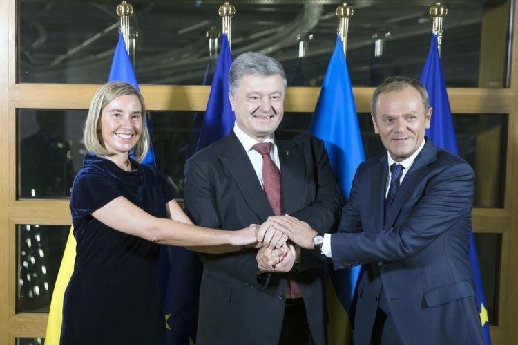 На знімку: Верховний представник ЄС із закордонних справ Федеріка Могеріні, Президент України П. Порошенко, Президент Європейської Ради Д. Туск (зліва направо) у Брюсселі.