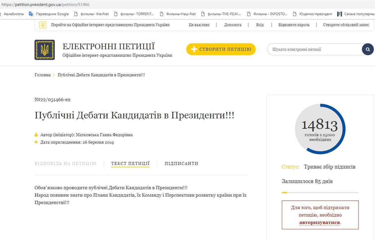 Тим часом на сайті електронних петицій Президента з’явилася петиція про публічні дебати кандидатів на посаду глави держави. Ініціатори документа наголошують на обов’язковості дебатів, бо українці повинні знати про плани кандидатів, їхні команди і перспективи розвитку держави за їх керівництва.
