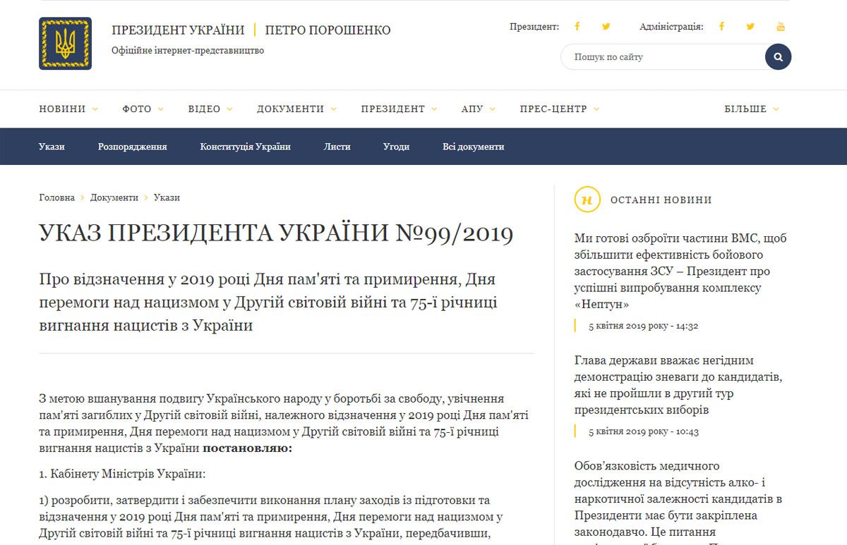 З метою вшанування подвигу Українського народу у боротьбі за свободу, увічнення пам’яті загиблих у Другій світовій війні, належного відзначення у 2019 році Дня пам’яті та примирення, Дня перемоги над нацизмом у Другій світовій війні та 75-ї річниці вигнання нацистів з України постановляю: