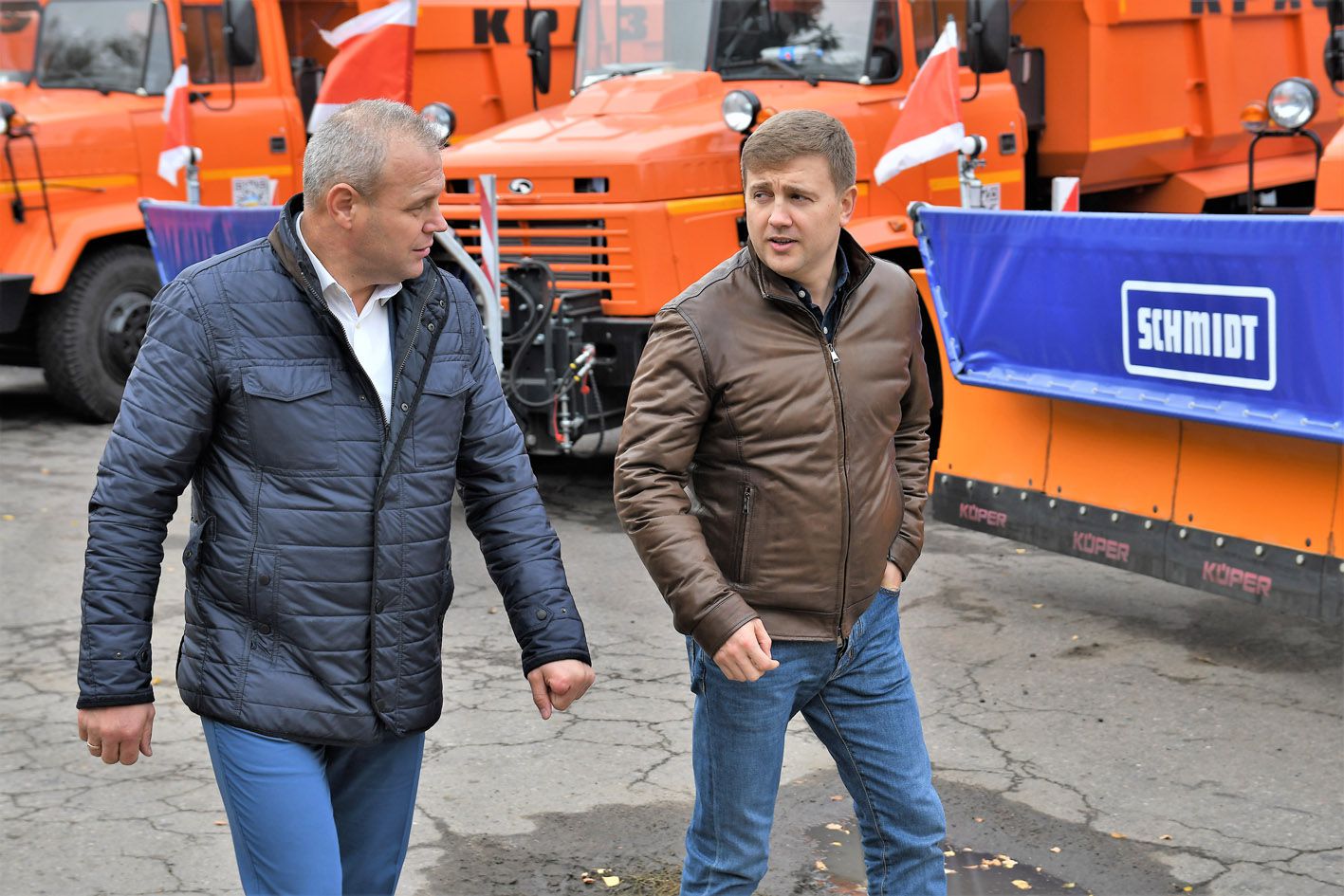 Голова Рівненської ОДА Віталій Ковальчук (праворуч) разом із керівником Рівненського облавтодору Володимиром Квачуком оглядають отримані КрАЗи.