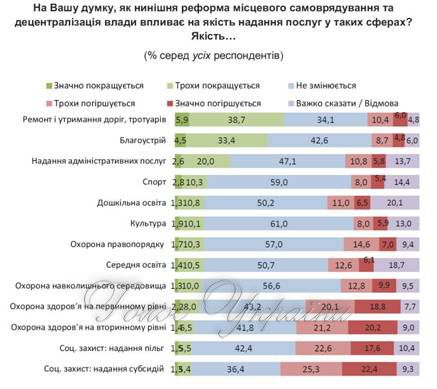 Дослідження КМІС показало, що найбільший позитивний ефект від децентралізації українці бачать у сфері ремонту та утримання доріг — 44,6% бачать значне або незначне покращення. Хоча навіть у цій сфері баланс сприйняття можна вважати негативним — 50,5% не бачать покращення або бачать погіршення. У сфері середньої освіти опитані налаштовані ще більш критично — бачать покращення 11,9%, не бачать покращення або бачать погіршення 69,4%.