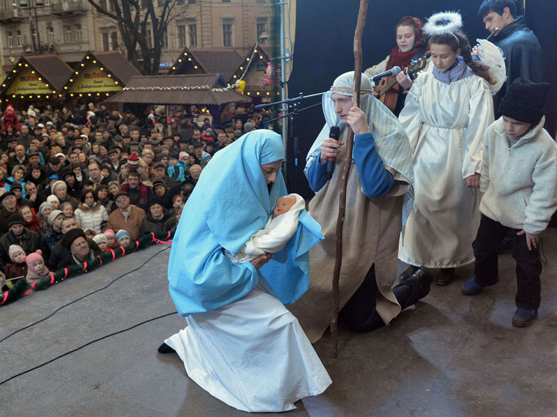 Львів. Різдвяні виступи вертепів біля головної ялинки.