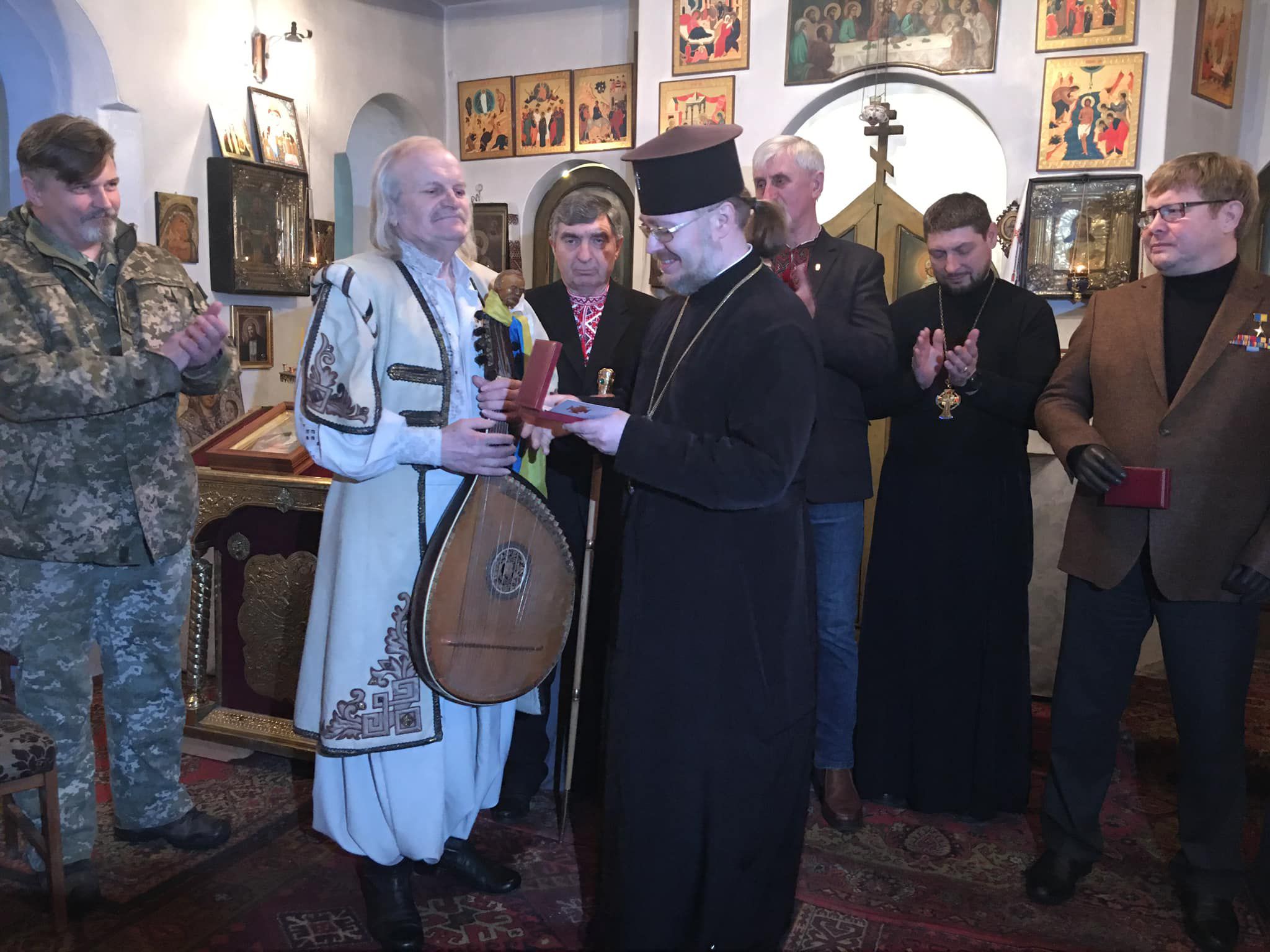 До речі, воїни отримали ще й мед з особистої пасіки Василя Малковича. Владика Сергій від імені Предстоятеля церкви вручив медалі «За жертовність та любов до України» Володимиру Жемчугову та Василю Нечепі. Артист сказав, що для нього це дуже дорога нагорода, прирівнювана ним до фронтової. До речі. У своїй біографії кобзар-лірник має виступ і в окопі на передовій, коли з початком третьої пісні окупанти стали стріляти, розкривши, до речі, цим свою вогневу точку. Питаю, а що ж ви таке співали, що росіяни так знервували? Нехотя відповідає: «Де Крим за горами, де сонечко сяє...». Нехотя, бо каже, що він артист і його справа — співати, а не стріляти. Власне, 70-річного артиста наші бойові хлопці швидко евакуювали