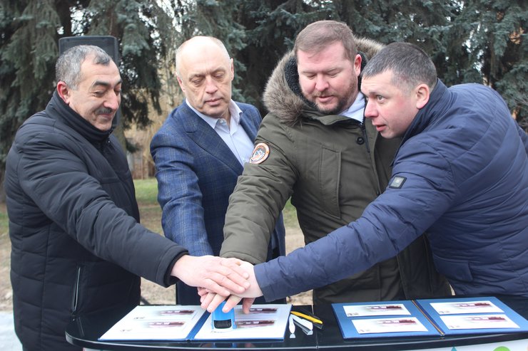 Церемонію спецпогашення марки з презентацією тематичного конверта виконали (зліва направо) Катіб Сафар-огли Мамедов, Олександр Мамай, Дмитро Лунін і керівник Полтавської дирекції «Укрпошти» Юрій Набасов.