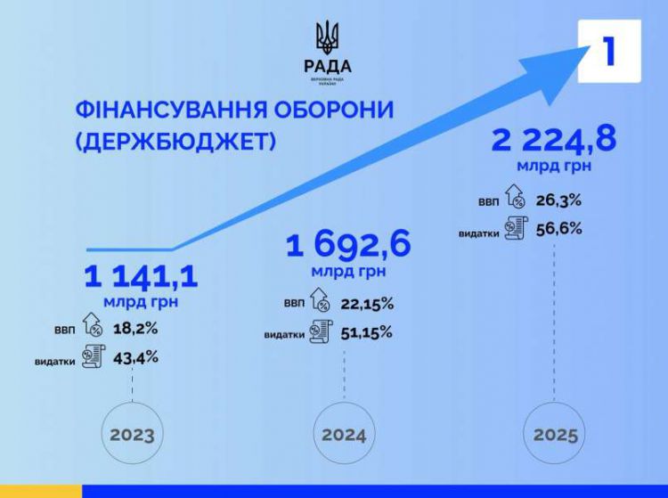З початку повномасштабного вторгнення фінансування обороноздатності України стало безумовним пріоритетом. У 2023 році на сектор безпеки й оборони було спрямовано 1 141,1 млрд грн, що становить 18,2% ВВП і 43,4% видатків бюджету, у 2024 році — 1 692,6 млрд грн (22,15% ВВП і 51,15% видатків бюджету), у 2025 році — 2 224,8 млрд грн (26,3% ВВП і 56,6% видатків). Це системне рішення концентрувати ресурси на головному завданні — захисті держави.