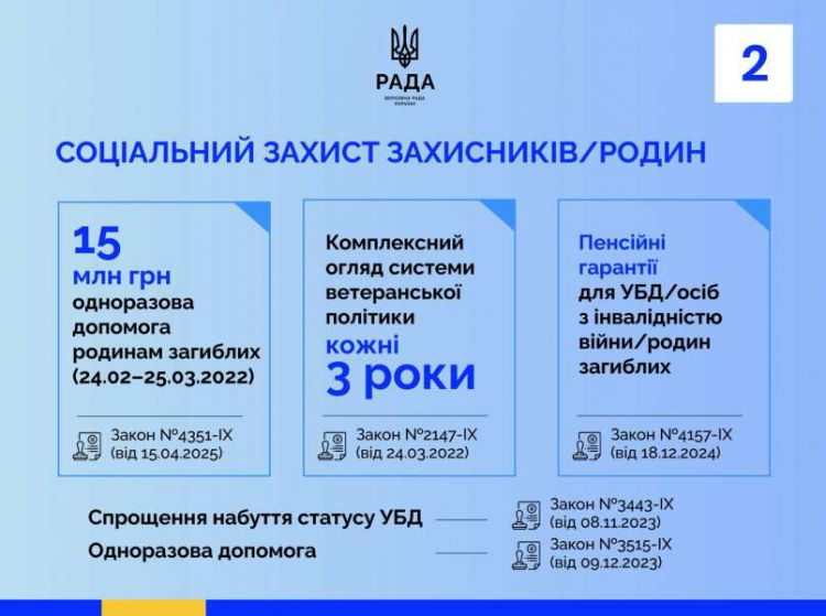 Соціальний блок законодавства посилив захист військових і їхніх родин. Родини загиблих отримують одноразову допомогу у 15 млн грн (№ 4351-IX); оновлено пенсійні гарантії для учасників бойових дій, осіб з інвалідністю війни та родин загиблих (№ 4157-IX); запроваджено регулярний комплексний огляд державної ветеранської політики раз на три роки