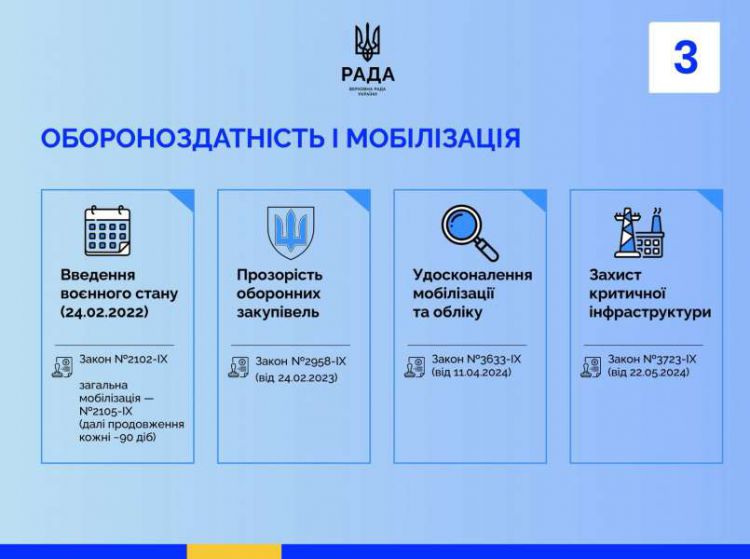 Від початку повномасштабного вторгнення Парламент працює безперервно й ухвалює рішення, що зміцнюють обороноздатність, підтримують військо, родини Захисників і Захисниць та економіку воєнного часу. За цей період ухвалено майже 900 законів і понад 1100 постанов — масштабний законодавчий масив, що забезпечує обороноздатність нашої країни та надає все необхідне тим, хто боронить державу.