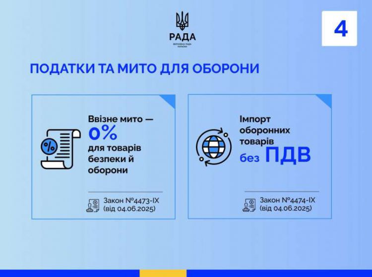 Економічні рішення Парламенту також спрямовані на забезпечення української армії. Закони № 4473-IX та № 4474-IX скасували мито і ПДВ на імпорт оборонних товарів. Закони № 4577-IX і № 4578-IX запровадили спеціальний правовий режим Defence City із податковими та митними пільгами, закон № 4254-IX стимулював благодійництво під час воєнного стану шляхом податкових пільг для допомоги фондам і постраждалим.