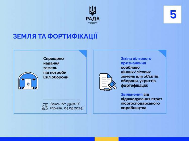 Для прискорення реальних робіт у тилу спрощено земельні процедури. Закон № 3948-IX полегшив зміну цільового призначення, у тому числі особливо цінних та лісових земель, під розміщення об’єктів оборони, укриттів і фортифікацій, а також передбачив необхідні звільнення від окремих відшкодувань, що пришвидшує будівництво й розгортання інженерних споруд.