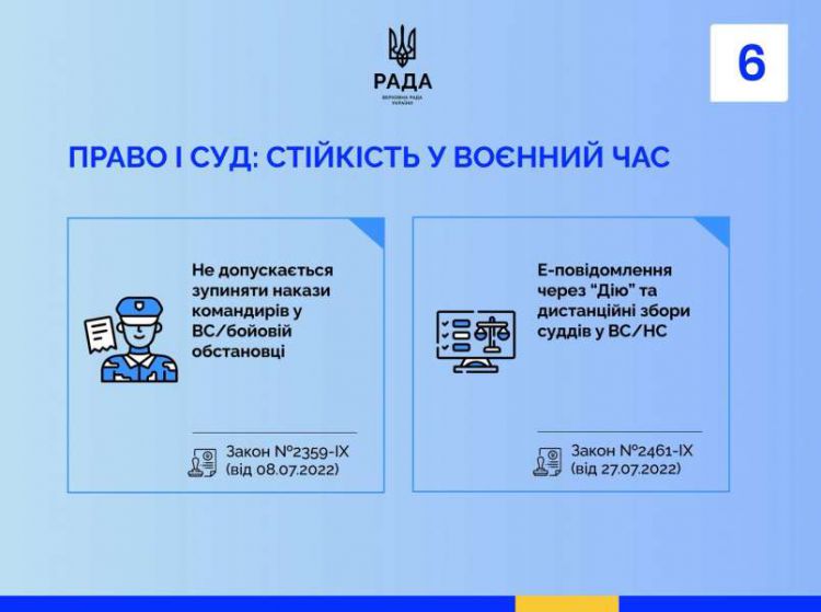 Правова система також була адаптована до умов дії воєнного стану і сьогодні забезпечує керованість на фронті та доступність правосуддя в тилу. Закон № 2359-IX забезпечив безперервність командування, заборонивши судове зупинення наказів командирів у бойових умовах, а закон № 2461-IX дозволив використовувати електронні повідомлення через Дію та дистанційний режим роботи органів суддівського врядування під час воєнного чи надзвичайного стану.