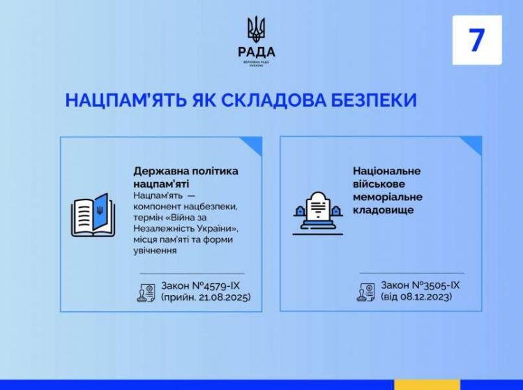 Окремим напрямом стала державна політика національної пам’яті. Закон № 4579-IX визнав нацпам’ять складовою національної безпеки, унормував ключові терміни та форми увічнення і визначив підходи до місць пам’яті; комплекс рішень підсилює закон № 3505-IX про створення Національного військового меморіального кладовища.