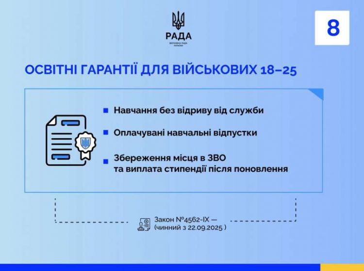 Важливою частиною підтримки є право на освіту для тих, хто служить. Закон № 4562-IX гарантує збереження місця у закладі освіти та стипендії, право на навчання без відриву від служби й оплачувані навчальні відпустки для військовослужбовців віком від 18 до 25 років; норми закону діють з 22 вересня 2025 року.