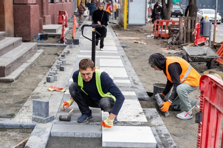 Наразі тривають роботи від Кельнського бульвару до вулиці Короленка, включно з площею Героїв Майдану. Демонтують старе покриття, встеляють нову бруківку з тактильною плиткою.
