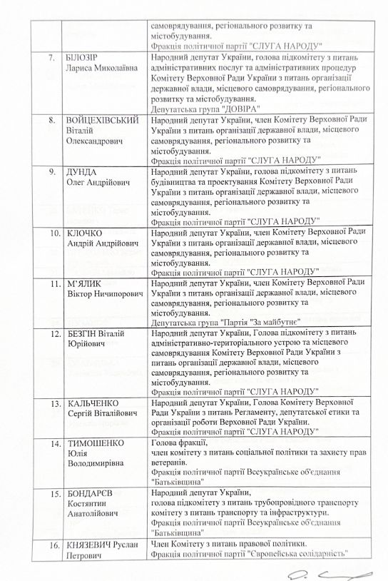 Станом на сьогодні до складу робочої групи входить 64 учасники, зокрема представники всіх парламентських фракцій і груп, Офісу Президента України, Кабінету Міністрів, військових структур, Центральної виборчої комісії, громадських організацій, Верховного Суду та експертного середовища.