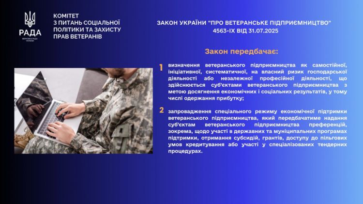 Протягом 2025 року Комітет Верховної Ради України з питань соціальної політики та захисту прав ветеранів послідовно й відповідально працював над формуванням сучасної ветеранської політики, спрямованої на подолання ключових суспільних викликів та підтримку ветеранів і членів їхніх сімей.