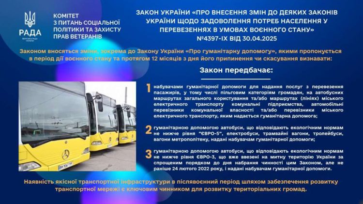 - Закон України «Про внесення змін до деяких законів України щодо задоволення потреб населення у перевезеннях в умовах воєнного стану» №4397-IX від 30.04.2025.