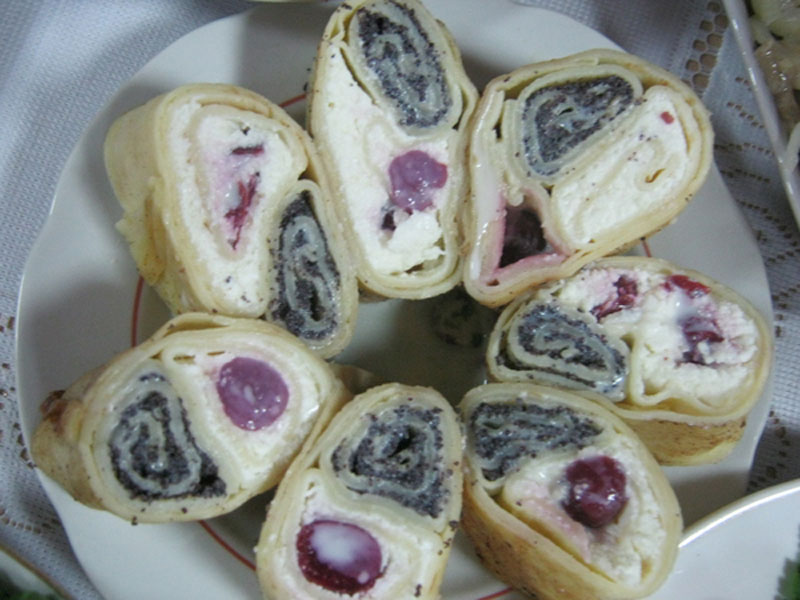 Вигадливі господині примудряються навіть звичайні налисники перетворити на кулінарні шедеври. Якщо маленьким млинцем із маком або вишнями начинити більший, із сиром, і нарізати на шматки (на знімку вгорі), то вийде дуже цікавий барвистий десерт, який пасуватиме до святкового столу.