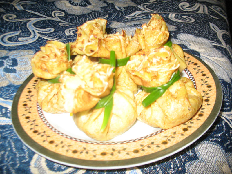 А ось мешканка села Рогиня Городенківського району Марія Гель у свої 102 роки подає до столу «торбинки», зроблені із налисника, начинені солоним сиром та перев’язані пером цибулі (на знімку внизу).