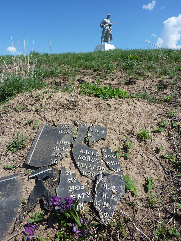 На знімку: в Новотроїцькому районі Херсонщини розбиті таблички з прізвищами загиблих у 1943—1944 роках воїнів вандали просто кинули поруч із братською могилою на березі Сиваша.