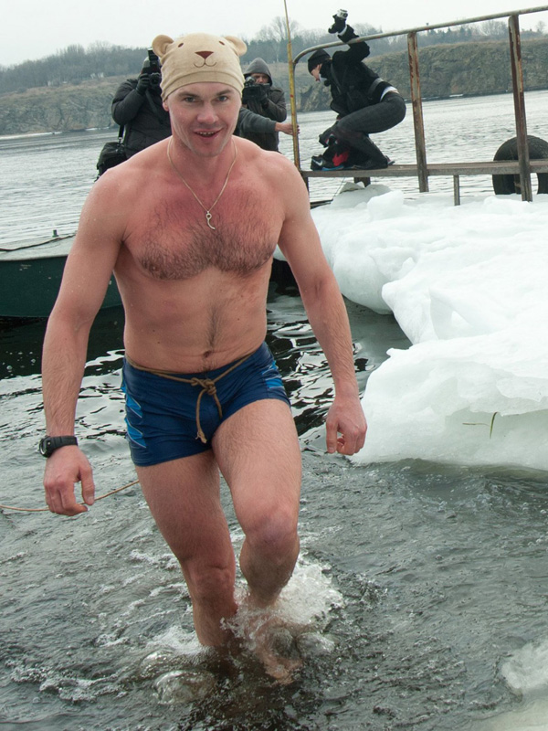 Член групи зимового плавання «Полярні ведмеді» Володимир Лук’яненко зробив це не вперше. Він перепливав Дніпро в Києві і збирається зробити це у Дніпропетровську. А перед цим, 28 лютого, трохи розім’явся в Запоріжжі.Того дня температура була лише 3 градуси тепла. Володимир міг постраждати від судоми. Тому передбачили засоби безпеки — човен із групою підтримки і мотузка на поясі плавця. Однак досвідчений морж, чи все ж «полярний ведмідь», усі таємниці плавання в подібних ситуаціях знає. Потрібно ще на березі розігріти м’язи, й тоді несподіванки майже виключені. Так і сталося — запорізькі 500 метрів Лук’яненко подолав за 10 хвилин. У Києві ж на 600 метрів йому знадобилося 14 хвилин. Одразу після запливу і хоробрий плавець, і вся його група підтримки вирушили до сауни.