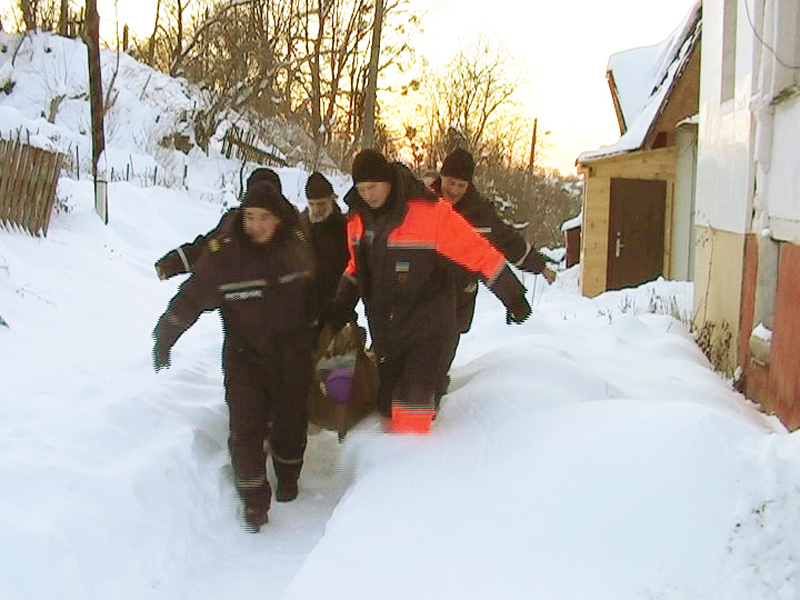 У Житомирі «швидка допомога» через снігові замети не змогла під’їхати до будинку жінки з переломами обох ніг. Оселя постраждалої розміщена у приватному секторі на схилі Замкової гори. Тож щоб доставити жінку до автомобіля, її треба було пронести понад 600 метрів вузенькою стежкою, прокладеною в глибокому снігу. Двом медпрацівницям — лікарю й фельдшеру — це було не під силу, тоді на допомогу їм направили рятувальників. Четверо бійців на ношах підняли 72-річну пенсіонерку на гору і передали медикам, які доправили її до лікарні. Ось хроніка діяльності підрозділів МНС Житомирщини за одну лише добу. У райцентрі Романові витягнули зі снігового замету машину швидкої допомоги, у Новограді-Волинському — борошновоз, у Коростишівському районі на трасі Київ—Чоп — легковий автомобіль, у якому було двійко малих дітей. У двох населених пунктах еменесники чистили дахи лікарні та школи.Фото прес-служби управління МНС у Житомирській області.