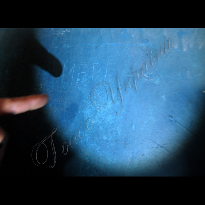 Вдова закатованого проукраїнського активіста Миколая Миренкова Ольга біля стени де вицарапано прізвище її чоловікаДонецька область. Місто Дружківка. Також депутати поспілкувалися зі звільненими із місця катувань проукраїнськими активістами та оглянули приміщення, у якому відбувалися розправи.