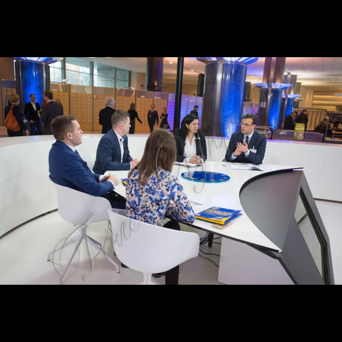 Телевізійні студії, інтерв’ю, включення скайпом за участі Голови ВР України Володимира Гройсмана та народних депутатів – членів української делегації.Бельгія, Брюссель.