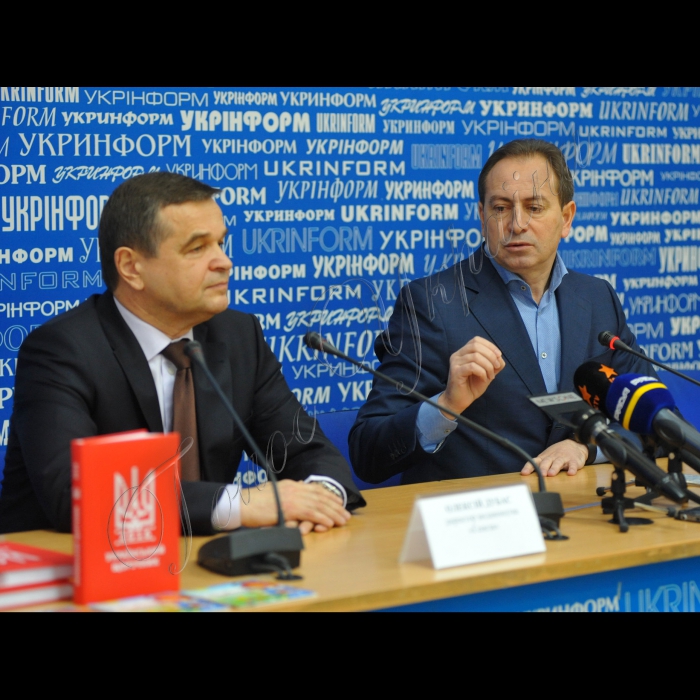 (Праворуч) Народний депутат України, засновник Фонду «Рідна країна» Микола Томенко, директор видавництва «Генеза» Олексій Дубас.Київ. У інформагентстві «Укрінформ» відбулась презентація просвітницької акції «Кобзар єднає Україну», що пройде у шевченківські дні на Донеччині. Ініціатори та організатори акції: Фонд Миколи Томенка «Рідна країна», видавництво «Генеза» та Донецька ОДА.