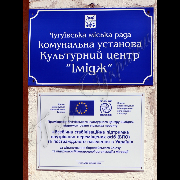 Оновлена актова зала комунальна установа Культурний центр «Імідж»25 травня 2016. Прес-тур за результатами реалізації проекту «Всеохопна стабілізаційна підтримка внутрішньо переміщених осіб та постраждалого населення в Україні», який фінансувався Європейським Союзом та впроваджувався Міжнародною організацією з міграції (МОМ). Харків, м. Чугуїв та смт. Новопокровка Харківської області.