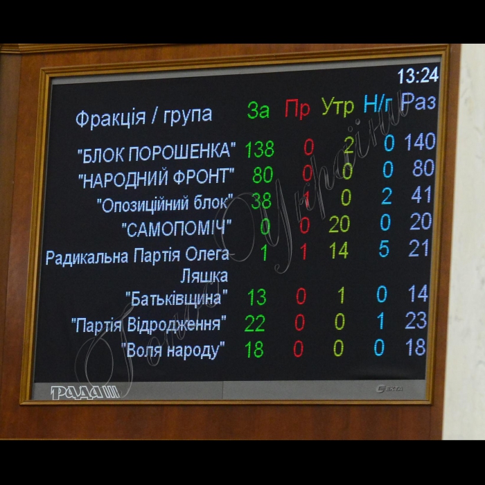 2 червня 2016. Пленарне засідання Верховної Ради України. Народні депутати прйняли проект закону про внесення змін до Конституції України (щодо правосуддя). За проголосували 335 депутатів. Табло з результатами голосування