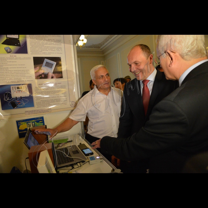 На фото – Леонід Файнзільберг - головний науковий співробітник Міжнародного науково-навчального центру інформаційних технологій та систем, доктор технічних наук, Андрій Парубій - Голова ВР України, Олександр Співаковський - Перший заступник голови Комітету Верховної Ради України з питань науки і освіти.Голова Верховної Ради України Андрій Парубій відкрив виставку наукових досягнень Національної академії наук України та національних галузевих академій наук Виставка проходитиме у стінах Парламенту 14 та15 червня 2016 року.