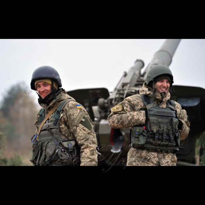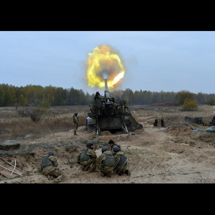 На полігоні «Дівички», що на Київщині відбулась практична фаза – тактичні навчання з бойовою стрільбою артилерійських підрозділів гарматами «Мста-Б» та «Піон». 21 жовтня 2016 Збройні Сили України навчаються.
