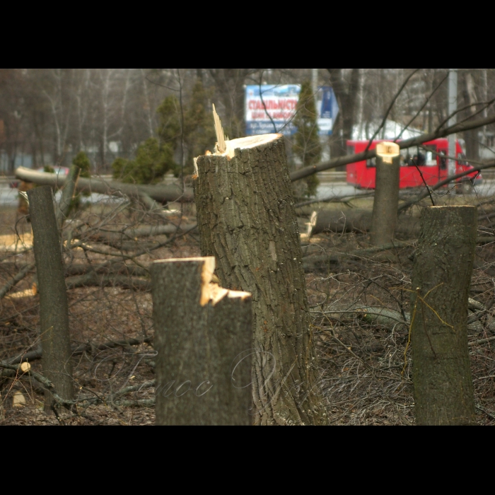 «Громадські активісти не дали повністю знищити сквер, але зеленим насадженням було завдано непоправної шкоди», - заявив Титикало.11 березня 2009 Київ, проспект Перемоги. Вирубано дерева під будівництво.