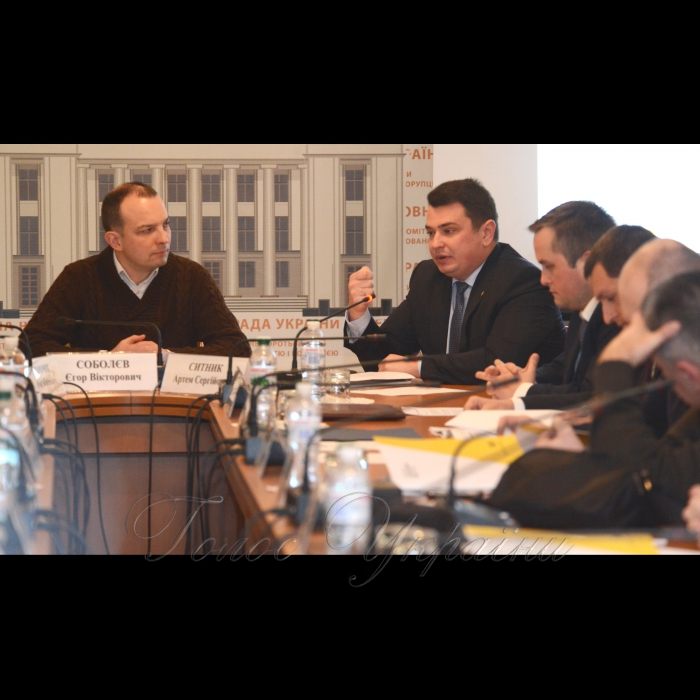 Єгор Соболєв, Голова Комітету Верховної Ради України з питань запобігання і протидії корупції; Артем Ситник, директор НАБУ; Назар Холодницький, заступник Генерального прокурора України – керівник Спеціалізованої прокуратури.15 лютого 2017 відкриті громадські слухання та обговорення письмового звіту керівництва Національного антикорупційного бюро України з основних питань діяльності Національного бюро.