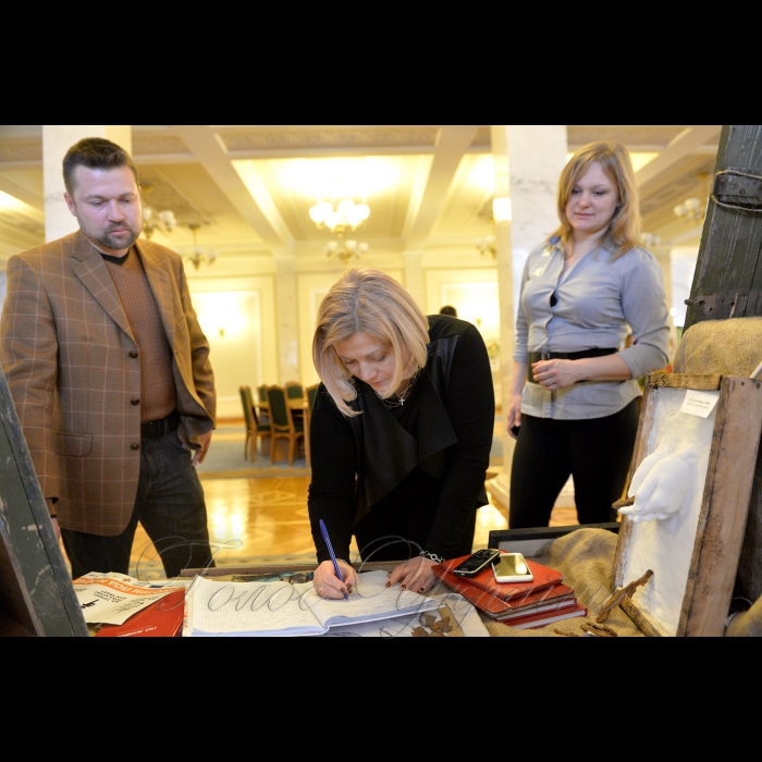 Перший заступник Голови ВР Ірина Геращенко поспілкувалася з художницею з Маріуполя Оленою Українцевою та поетом Олегом Українцевим, її чоловіком. (НА ФОТО) (ще один творець картин художниця Анна Торкаєнко відсутня на фото). Митці розповіли про свій художній проект «Маріуполь на межі», який складається з картин, книг, артефактів прифронтового міста. Виставка вже об’їхала всю україну, нині експонується у ВР.