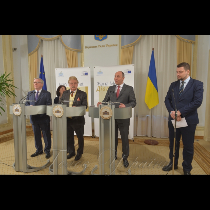 20 квітня 2017 спільний брифінг Голови Верховної Ради України Андрія Парубія, координатора програми Європейського Парламенту з підвищення інституційної спроможності Верховної Ради України Пета Кокса і Голови Комітету Європарламенту у закордонних справах Елмара Брока.