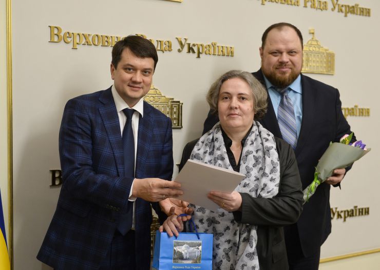 Голова Верховної Ради України Дмитро Разумков, Заступник завідувача відділу оглядачів газети «Голос України» Галина Квітка, Перший заступник Голови Верховної Ради України Руслан СтефанчукГолова Верховної Ради України Дмитро Разумков, Перший заступник Голови Верховної Ради України Руслан Стефанчук привітали жінок апарату з наступаючим днем 8 березня і вручили нагороди та цінні подарунки.