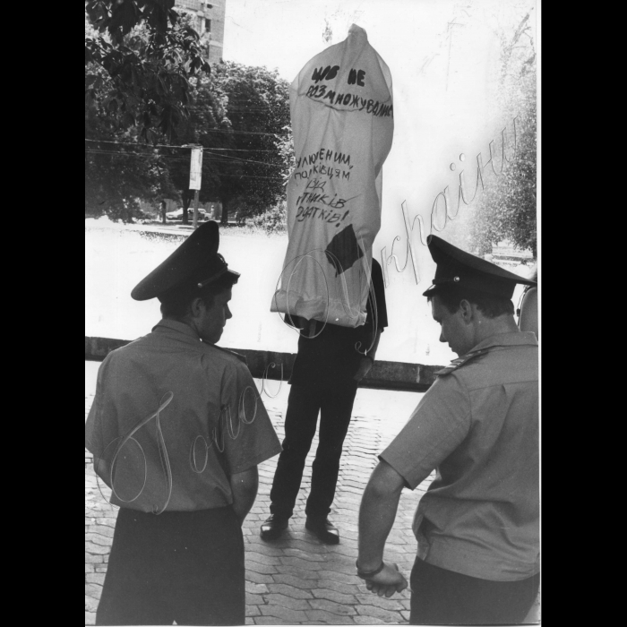 Молодіжна організація "Молодь - надія України" провела акцію біля Київради з зверненням до міського голови А. Омельченко скасувати рішення про підвищення тарифів на комуналку. Персонаж з п'єси "Останній киянин"18.09.1999.