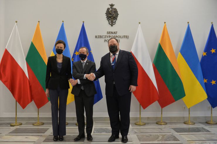 Спільний перехід Голови Верховної Ради України Руслана Стефанчука, Голови Сеймасу Литовської Республіки Вікторія Чміліте-Нільсен та Маршалка Сенату Республіки Польща проф. Томаша Гродзького до місця проведення засідання Міжпарламентської асамблеї (зала пленарних засідань Сенату РП).