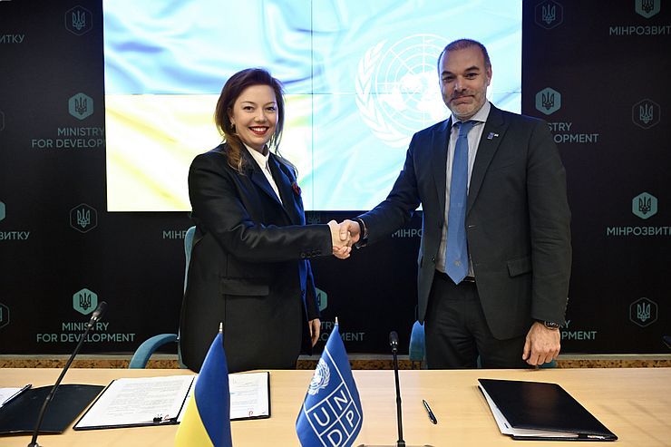 Фінансову угоду підписали Перша заступниця Міністра розвитку громад та територій України Альона Шкрум та заступник Постійного представника ПРООН в Україні Христофорос Політіс.