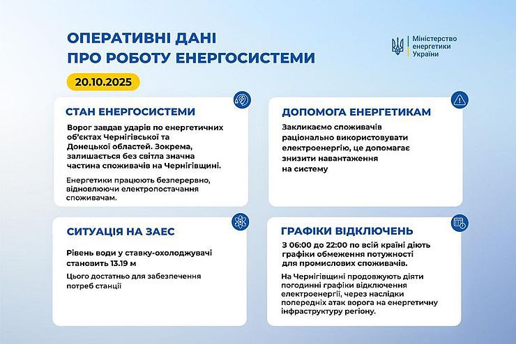 Ворог завдав ударів по енергетичних об’єктах Чернігівської та Донецької областей. Зокрема, залишається без світла значна частина споживачів на Чернігівщині. Енергетики працюють безперервно, відновлюючи електропостачання споживачам.