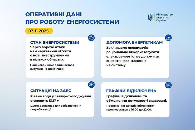Через ворожі атаки на енергетичні об’єкти є нові знеструмлення в кількох областях. Найскладнішою залишається ситуація на Донеччині. На пошкоджених об’єктах енергетичної інфраструктури тривають ремонтно-відновлювальні роботи.